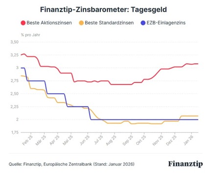 Finanztip Verbraucherinformation GmbH - ein Unternehmen der Finanztip Stiftung: Pressemitteilung Tagesgeld: Zinsangebote bringen Sparern 100 Euro Zinsen mehr in sechs Monaten Berlin, 04.02.2026 – Kurz vor dem Zinsentscheid der Europäischen Zentralbank (EZB) am Donnerstag sind die Zinsen für Tagesgeldkonten stark gestiegen. ...